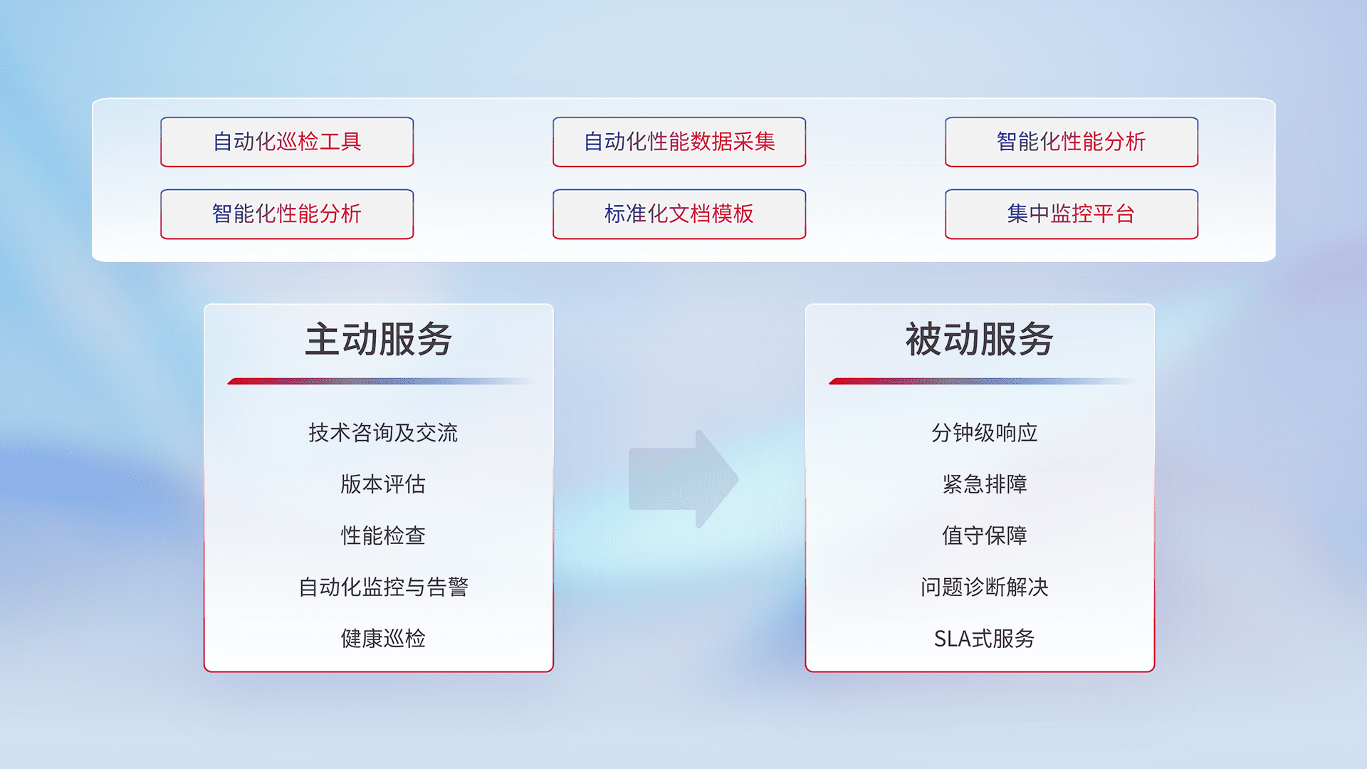 智能化工具和标准化文档,,,保障服务质量,,提供主动服务(包含技术咨询、、版本评估、、性能检查、、、、自动化监控与告警、、、健康巡检)和被动服务包含(分钟级响应、、、、紧急排障、、、、值守保障、、、、问题诊断解决、、、SLA服务)。。。